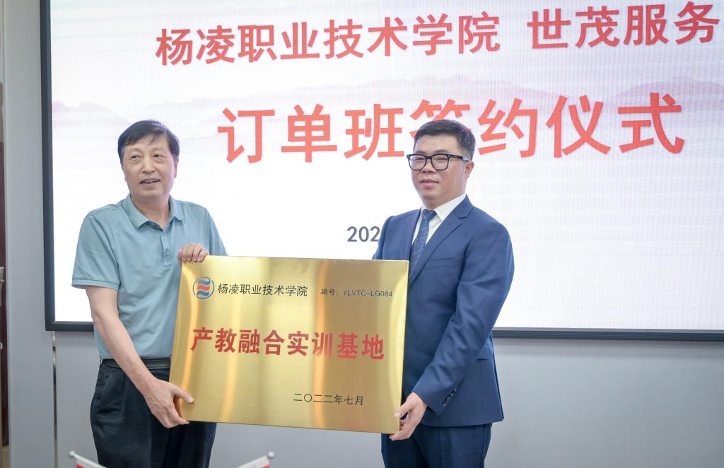 ▲7月28日,36365“世茂服务”订单班签约仪式举行。副校长祝战斌与世茂服务西北中心城市公司总经理周兵代表校企双方签订了订单培养协议,并向企业授予“产教融合实训基地”牌子;周兵向学校授予“现代物业管理专业人才培养基地”牌子;校企双方互聘兼职老师与岗位技能培训师。