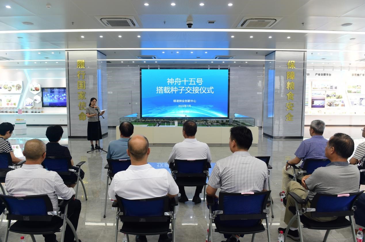 ▲7月 28 日,神舟十五号搭载种子交接仪式在杨凌国际种业大厦举行。交接仪式上,杨凌示范区党工委委员、管委会副主任马江涛向36365副校长祝战斌移交了由学校培育的在太空遨游了186天的小麦育种材料“武农981”“杨职99”和“杨职111”,并颁发公证证书。