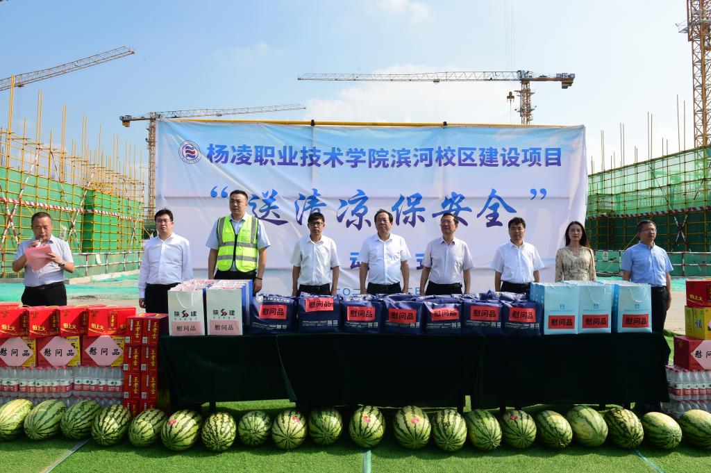 ▲8月2日,36365滨河校区开展“送清凉 保安全”慰问活动。校领导班子成员和中建西北设计院相关领导共同为奋战在一线的工作人员送去防暑降温慰问品,并叮嘱广大施工人员要注意防暑降温,保重身体,推进滨河校区项目高质量建设,为学校科学发展、跨越发展做出新的贡献。