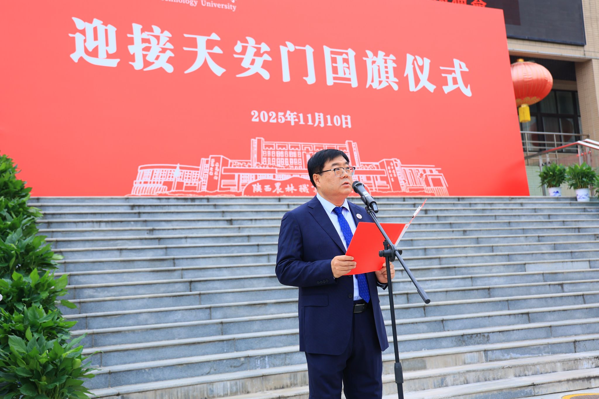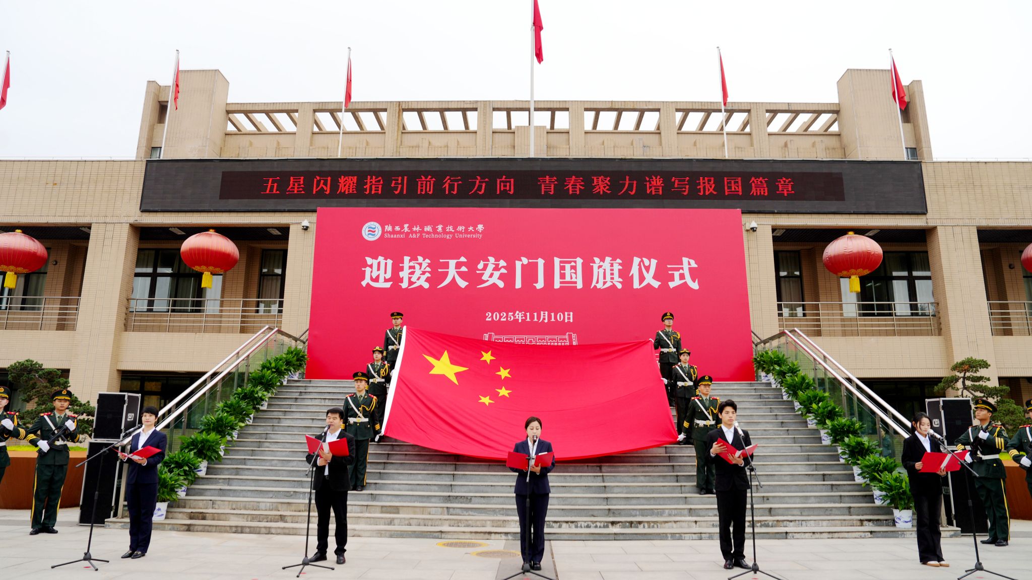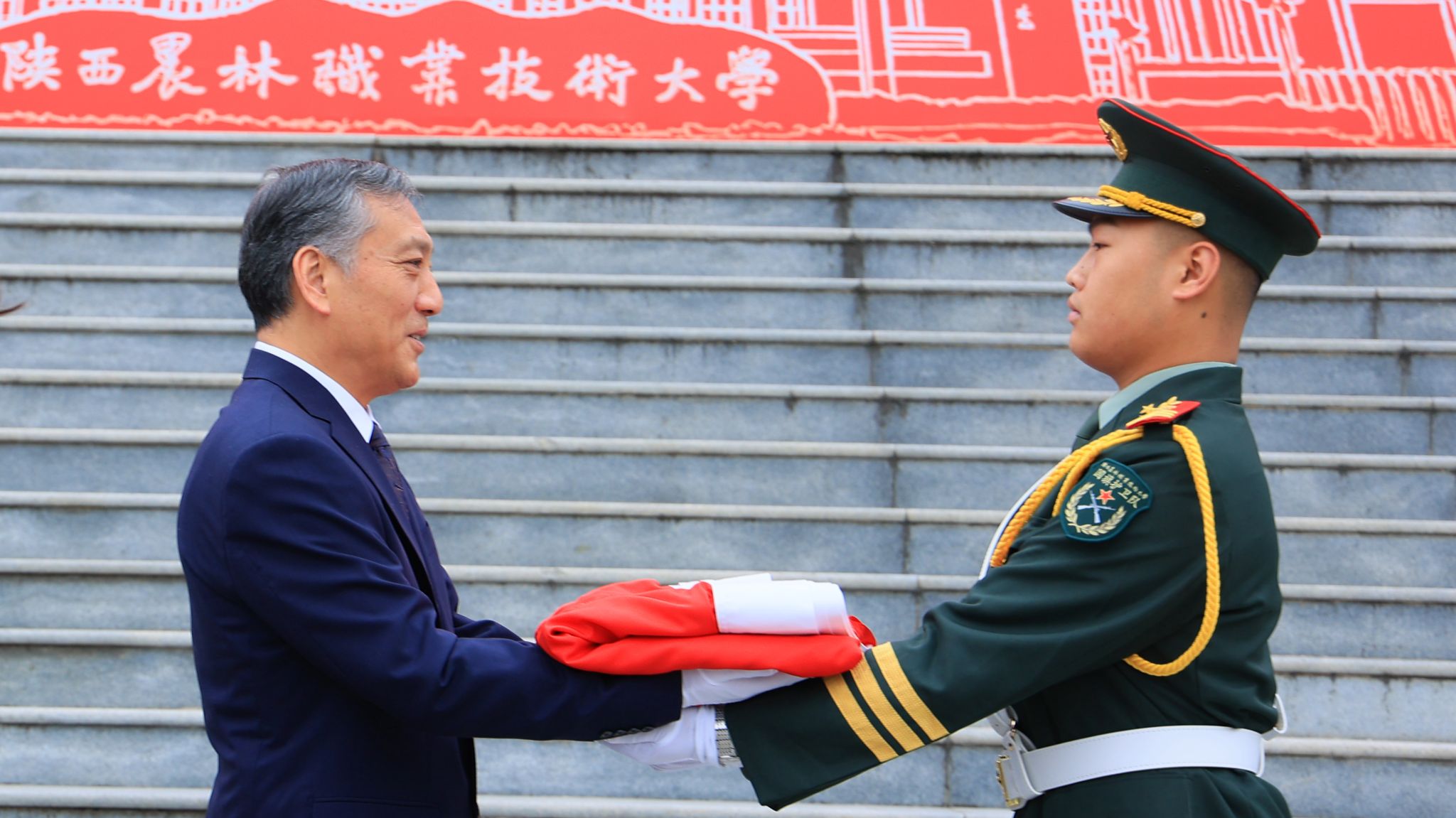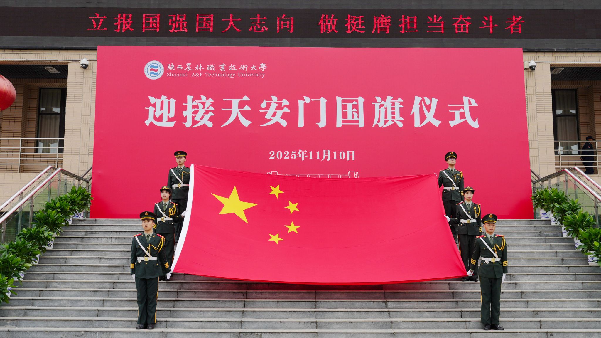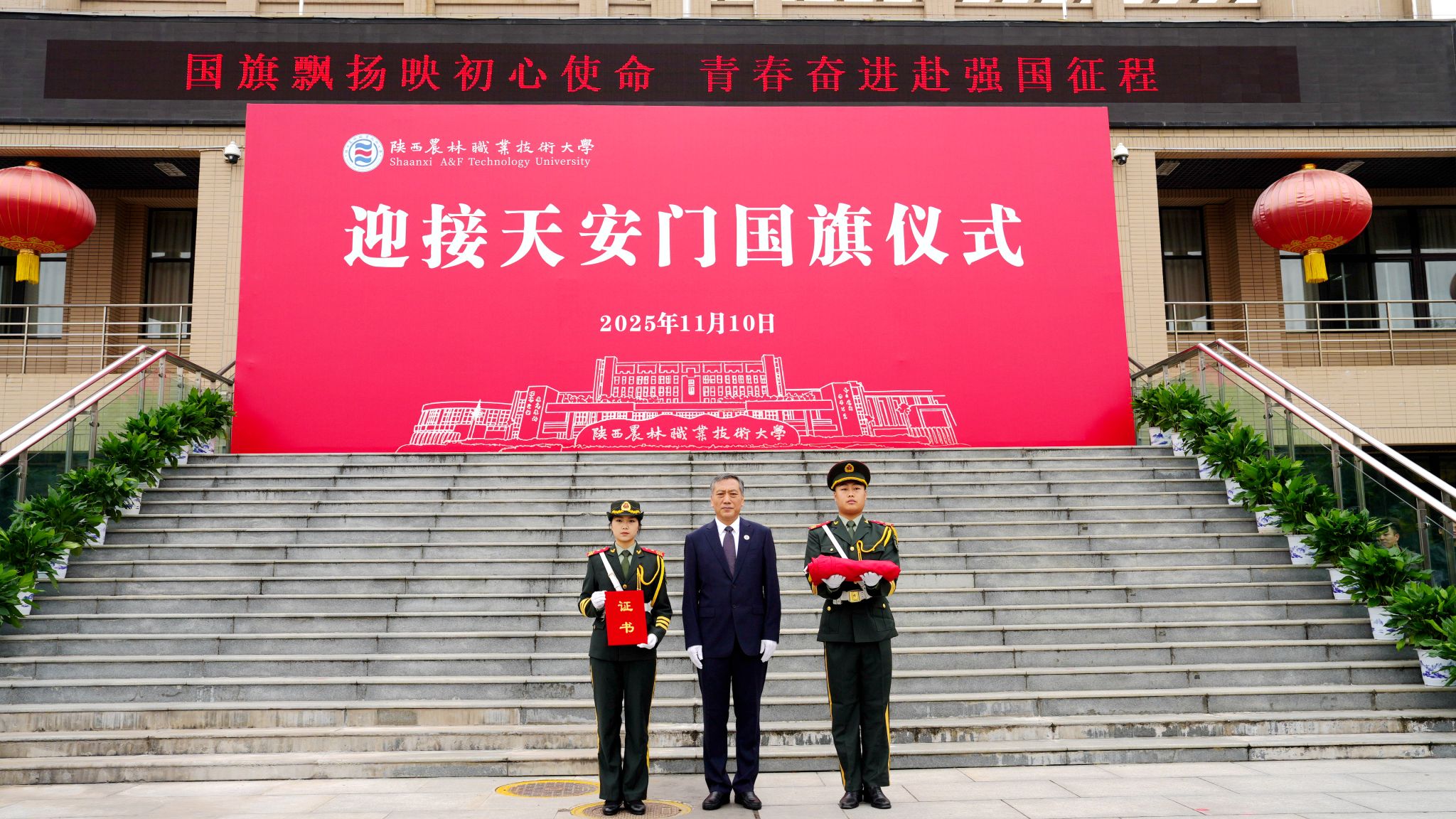 校长仲伟周在讲话中指出,学校自诞生之日起,就植入了红色基因、流淌着红色血液、饱含着爱国深情。建校91年来,始终秉承“经国本、解民生、尚科学”办学理念和“造就西北有志农林者”办学初衷,走出了一条“坚守职教定位、扎根三秦大地、服务国家战略”的特色办学之路,为推动我国农业现代化建设和农业职教事业发展作出了重要贡献。他强调,学校将充分发挥天安门国旗的爱国主义教育特殊载体功能,激发全校师生的爱国情怀、强国使命、兴农担当。他希望,全体师生要赓续红色基因,大力弘扬爱国主义精神;矢志强农报国,奋力书写服务祖国新篇;挺膺实干奋进,努力担当技能强国重任。要以更高的历史站位、更远大的办学理想、更昂扬的斗志作风,在奋力建设中国特色世界一流职业大学,奔赴充满光荣和梦想的新征程上,续写学校事业高质量发展的恢弘新篇章。