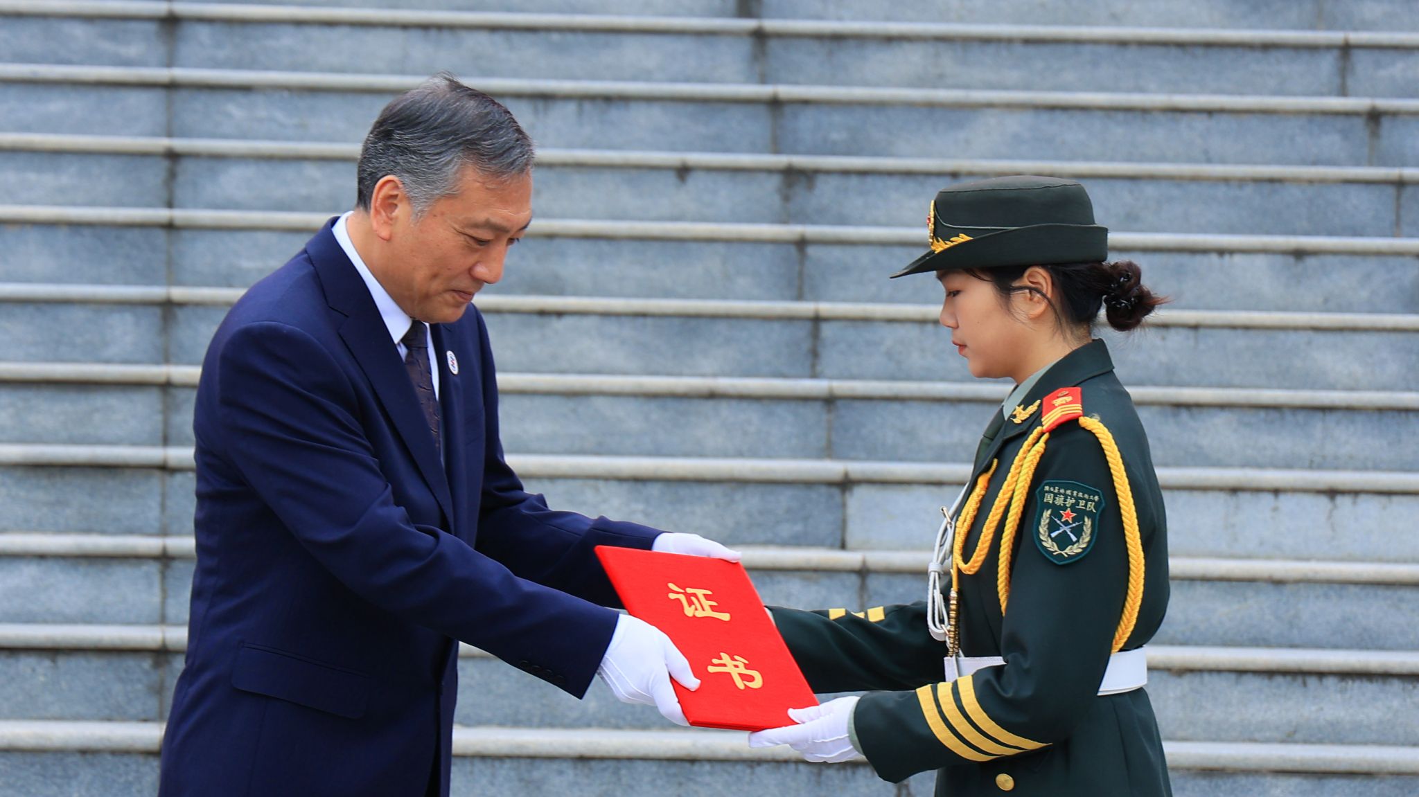 党委书记韩明军将获赠国旗及证书移交学校国旗护卫队