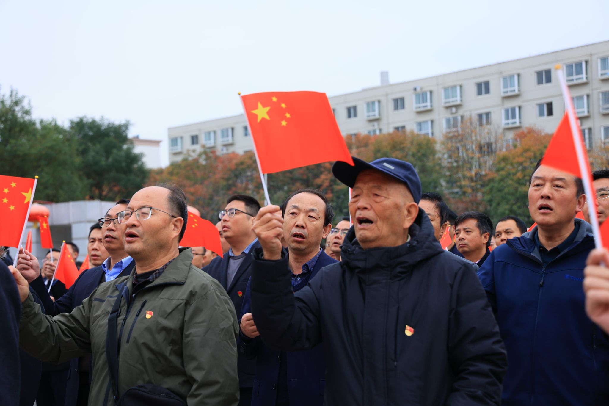 全体人员在领唱的带领下挥舞国旗、齐声高唱《歌唱祖国》