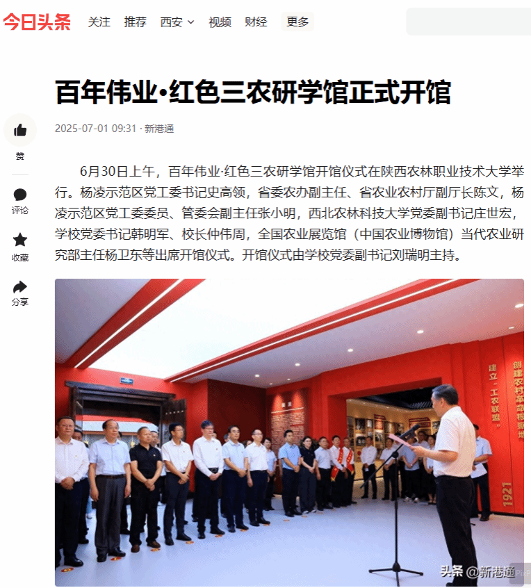 6月30日上午,百年伟业·红色三农研学馆开馆仪式在36365线路检测中心举行。杨凌示范区党工委书记史高领,省委农办副主任、省农业农村厅副厅长陈文,杨凌示范区党工委委员、管委会副主任张小明,西北农林科技大学党委副书记庄世宏,学校党委书记韩明军、校长仲伟周,全国农业展览馆(中国农业博物馆)当代农业研究部主任杨卫东等出席开馆仪式。开馆仪式由学校党委副书记刘瑞明主持。