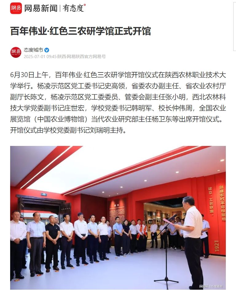 韩明军在致辞中指出,建设百年伟业·红色三农研学馆是学校深入学习贯彻习近平总书记关于“三农”工作重要论述的重要体现。他表示,学校将以研学馆为平台,教育引导广大师生深入了解中国共产党解决“三农”问题的光辉历程,厚植“三农”情怀,不忘初心使命,勇挑强农兴农重担。作为农业农村部庆祝中国共产党成立100周年主题展巡展点、陕西省农村基层干部培训基地、杨凌示范区研学教育实践基地,研学馆将积极主动服务杨凌示范区发展,服务、辐射全省、全国旱区乃至全国党员干部、大中小学生的红色三农教育工作,凝聚更加强大的力量,为农业高质高效、乡村宜居宜业、农民富裕富足作出更大的贡献。