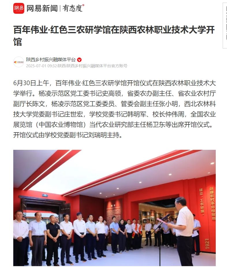 6月30日上午,百年伟业·红色三农研学馆开馆仪式在36365线路检测中心举行。杨凌示范区党工委书记史高领,省委农办副主任、省农业农村厅副厅长陈文,杨凌示范区党工委委员、管委会副主任张小明,西北农林科技大学党委副书记庄世宏,学校党委书记韩明军、校长仲伟周,全国农业展览馆(中国农业博物馆)当代农业研究部主任杨卫东等出席开馆仪式。开馆仪式由学校党委副书记刘瑞明主持。