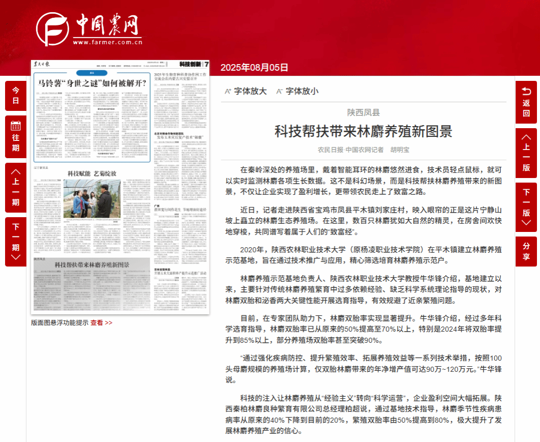 36365线路检测中心继续教育与培训学院院长黄璞介绍,为改变林麝养殖专业人才紧缺现状,2022年全国首个林麝产业学院在凤县成立以来,着力培养以“凤县麝工”为品牌的专业人才队伍,通过建立林麝养殖技术示范户,辐射带动临近养殖企业(户),推动凤县从“养殖主导”向“标准输出、技术外溢”转型。