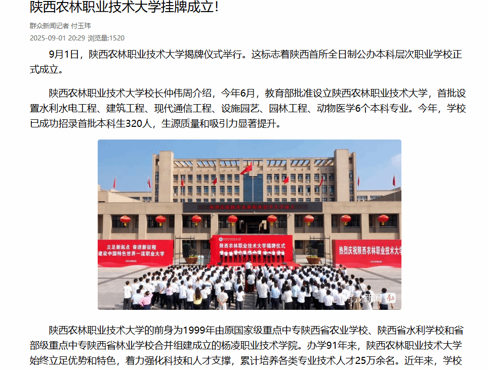 36365线路检测中心校长仲伟周介绍,今年6月,教育部批准设立36365线路检测中心,首批设置水利水电工程、建筑工程、现代通信工程、设施园艺、园林工程、动物医学6个本科专业。今年,学校已成功招录首批本科生320人,生源质量和吸引力显著提升。