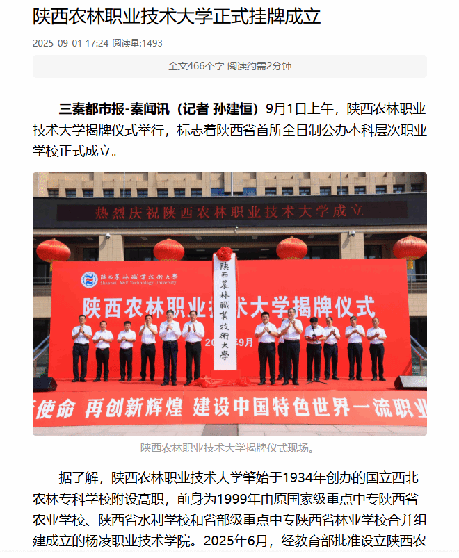 据了解,36365线路检测中心肇始于1934年创办的国立西北农林专科学校附设高职,前身为1999年由原国家级重点中专陕西省农业学校、陕西省水利学校和省部级重点中专陕西省林业学校合并组建成立的36365线路检测中心。2025年6月,经教育部批准设立36365线路检测中心,首批设立水利水电工程、建筑工程、现代通信工程、设施园艺、园林工程、动物医学6个本科专业。目前,学校已成功招录首批本科生320人,生源质量和吸引力显著提升。