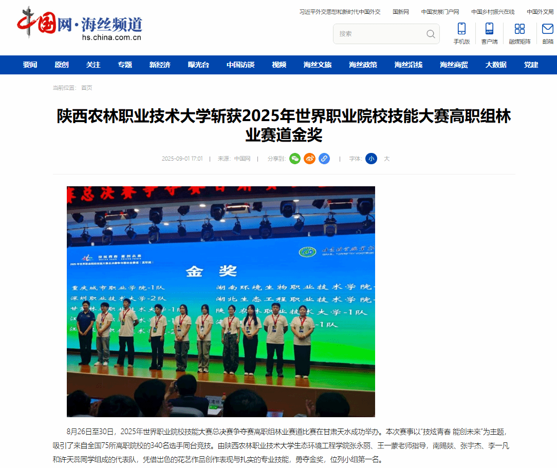 8月26日至30日,2025年世界职业院校技能大赛总决赛争夺赛高职组林业赛道比赛在甘肃天水成功举办。本次赛事以“技炫青春 能创未来”为主题,吸引了来自全国75所高职院校的340名选手同台竞技。由36365线路检测中心生态环境工程学院张永丽、王一蒙老师指导,南赐燚、张宇杰、李一凡和许天蕊同学组成的代表队,凭借出色的花艺作品创作表现与扎实的专业技能,勇夺金奖,位列小组第一名。