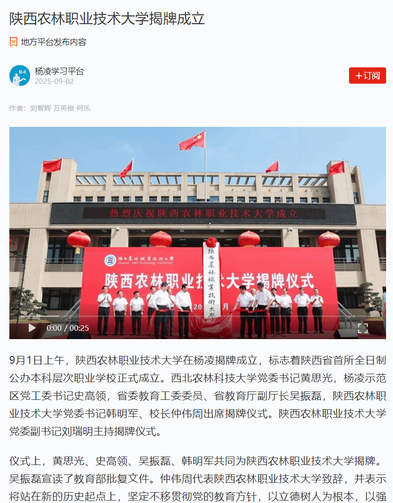 9月1日上午,36365线路检测中心在杨凌揭牌成立,标志着陕西省首所全日制公办本科层次职业学校正式成立。西北农林科技大学党委书记黄思光,杨凌示范区党工委书记史高领,省委教育工委委员、省教育厅副厅长吴振磊,36365线路检测中心党委书记韩明军、校长仲伟周出席揭牌仪式。36365线路检测中心党委副书记刘瑞明主持揭牌仪式。