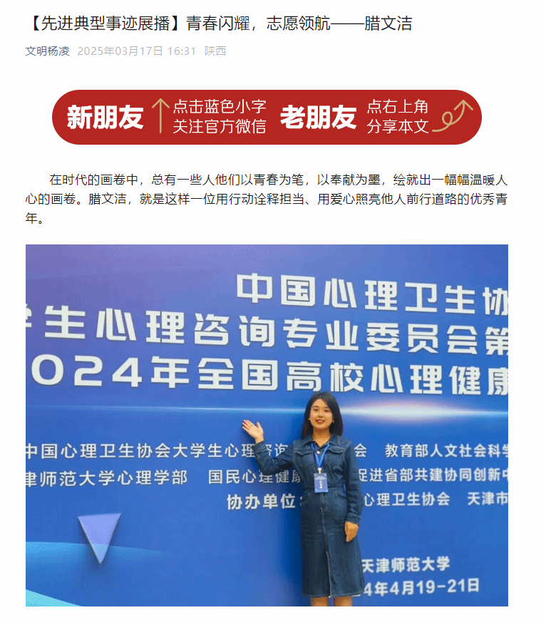腊文洁用自己的青春和汗水,传承弘扬志愿服务精神,支持帮助青年成长,以实际行动诠释责任与担当,让我们看到了青春的无限可能和力量。