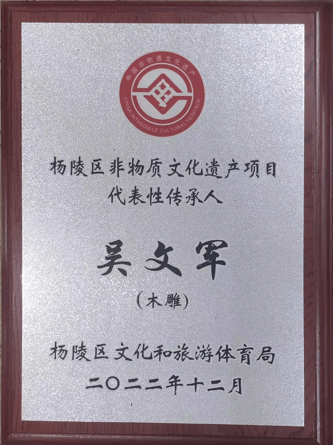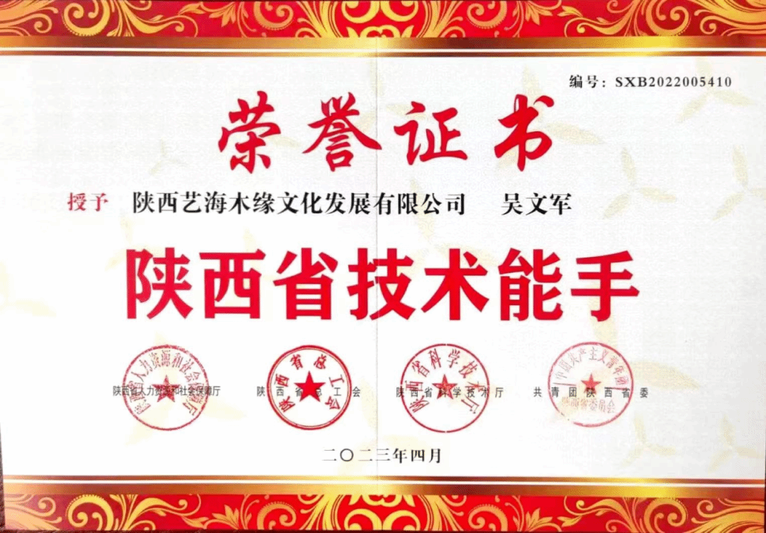 2022年,被认定为杨凌区非物质文化遗产项目代表性传承人。2023年,成功申报陕西省技能大师工作室,获评陕西省技术能手;取得一级木雕工技能等级证书和工艺品雕刻工二级职业技能等级证书。2024年,作品《花好月圆》荣获陕西省工艺美术精品展金奖