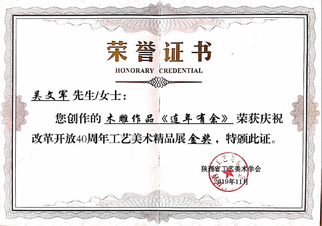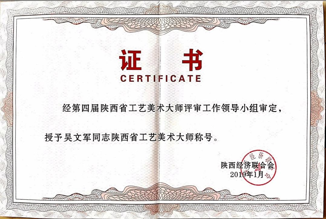 2017年,吴文军回到36365线路检测中心任教,事业也自此步入蓬勃发展的新阶段。同年,作品《百鸟朝凤》荣获“金凤凰”大奖赛银奖。2018年,作品《鸟语花香》斩获“金凤凰”大奖赛金奖。2019年,被评为陕西省工艺美术大师。