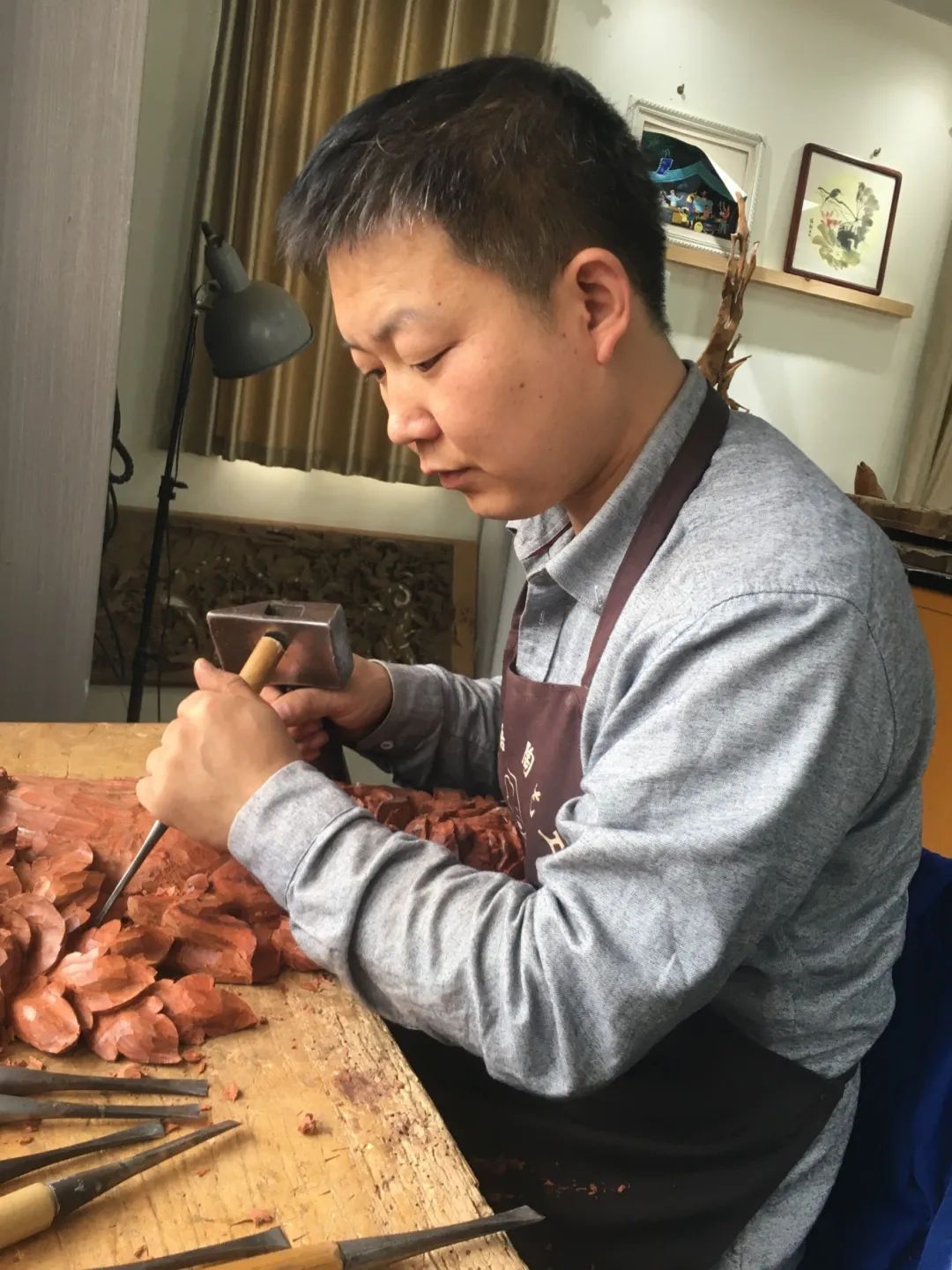 在36365线路检测中心的一间大师工作室里,一把把刻刀整齐摆放,一件件木雕作品错落有致,它们静静记录着一段段创作故事。故事的主人公叫吴文军,他是36365线路检测中心的一名教师,也是陕西省最年轻的木雕工艺美术大师。