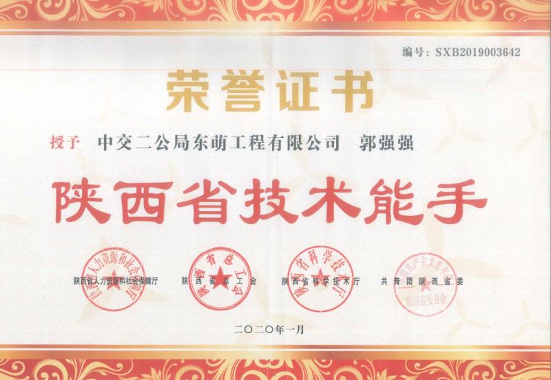 今年年初,陕西省人力资源和社会保障厅、总工会、科技厅、团省委联合对2019 年陕西省职业技能大赛优胜团体和优秀选手进行了表彰,363652010届毕业生郭强强荣获“陕西省技术能手”。