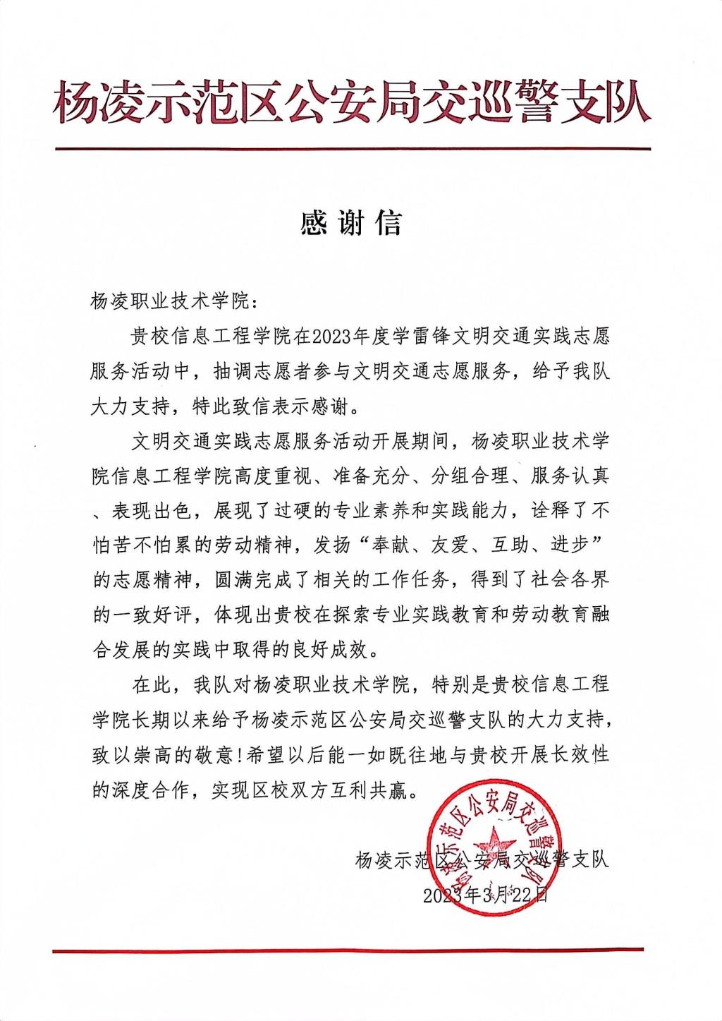 活动期间,杨凌示范区公安局交巡警支队向36365发来了感谢信,对36365表示感谢,对志愿者出色的表现进行了表扬,并希望能一如既往地开展长效性的深度合作,实现区校双方互利共赢。志愿者们纷纷表示,将进一步传递文明交通正能量,发挥好新时代志愿者的示范引领作用,大力发扬“奉献、友爱、互助、进步”的志愿精神,在传承雷锋精神中展现杨职青年担当,贡献杨职青年力量。