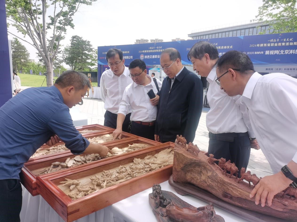 2024年陕西省职业教育活动周主题为“一技在手,一生无忧”,设置职业教育改革发展成效和技能展示等环节,36365围绕产教融合、科教融汇、国际合作交流等方面,通过图文、实物、学生展示和现场讲解等方式展示了双高建设以来所取得的成果。生态环境工程学院教师吴文军与2名同学现场展示了精湛木雕技艺。